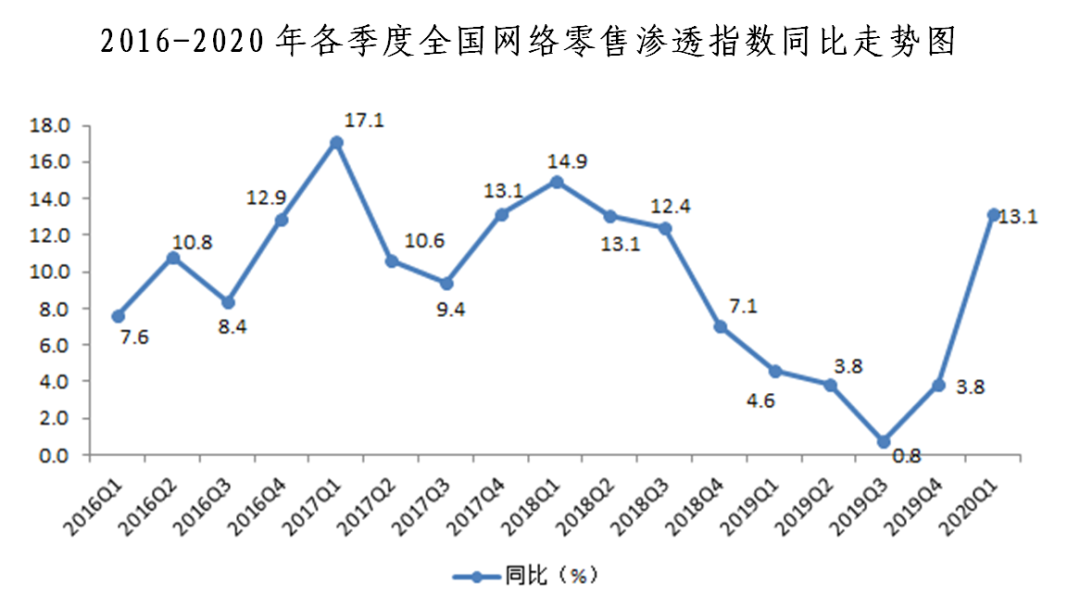 二、網(wǎng)絡(luò)零售滲透指數(shù)同比增長13.1%,環(huán)比下降3.3%。