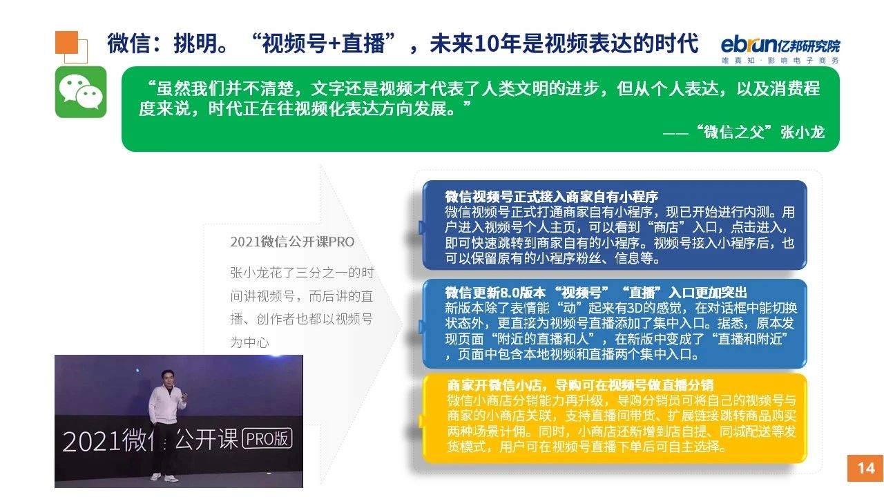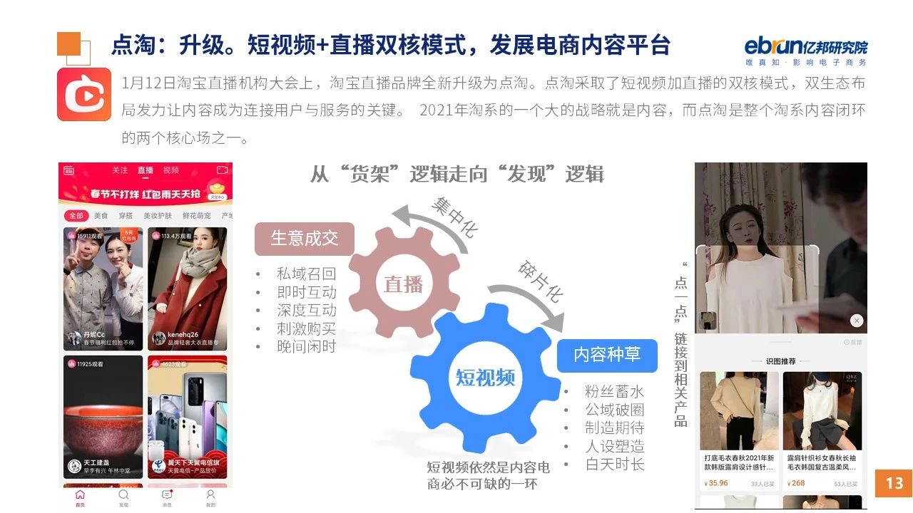 纵观2021年1月,各平台丰富自有生态布局,如淘宝直播(点淘)加入短视频模式、腾讯重押视频号、快手加码电商和小程序、抖音推出支付等;视频内容成为各平台未来重点发力方向;“九不得”新规发布后社区团购仍热情不减;国家和市场对互联网巨头和电商相关消费加大监管力度……你信和不信,你知道和不知道的,都在这份亿邦动力研究院正式发布的